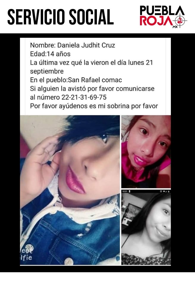 Familiares y amigos de Daniela Judith Cruz de 14 años, denunciaron que desapareció en San Rafael Comac del municipio de San Andrés Cholula.