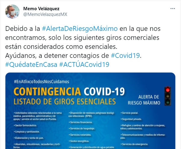 Inicio Atlixco Emiten recomendaciones vs Covid19 en Atlixco Atlixco Emiten recomendaciones vs Covid19 en Atlixco marzo 10, 2021 532 FacebookTwitterPinterestWhatsApp Debido a la #AlertaDeRiesgoMáximo en la que nos encontramos, solo los siguientes giros comerciales están considerados como esenciales. Ayúdanos, a detener contagios de #Covid19. #QuédateEnCasa #ACTÚACovid19