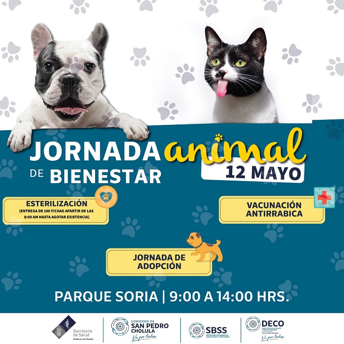 San Pedro Cholula.- Este viernes 12 de mayo desde las 09:00 hasta las 14:00 horas, Parque Soria será sede de la Primera Jornada Animal de Bienestar, donde habrá esterilización, vacunación antirrábica y jornada de adopción.