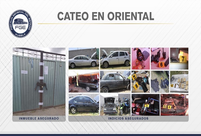 En seguimiento a hechos fuera de la Ley, la Fiscalía General del Estado de Puebla cumplió orden de cateo al interior de un inmueble en el municipio de Oriental donde aseguró ocho unidades vehiculares y equipo táctico, entre otros indicios.