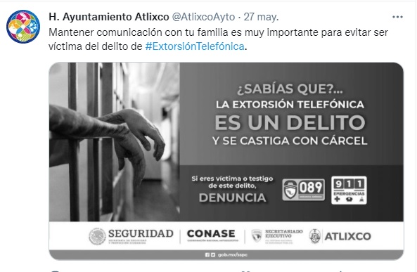 Inicio Atlixco Gobierno de Atlixco emite recomendaciones para evitar extorsión telefónica Atlixco Gobierno de Atlixco emite recomendaciones para evitar extorsión telefónica junio 8, 2021 506 FacebookTwitterPinterestWhatsApp Redacción Mantener comunicación con tu familia es muy importante para evitar ser víctima del delito de #ExtorsiónTelefónica.