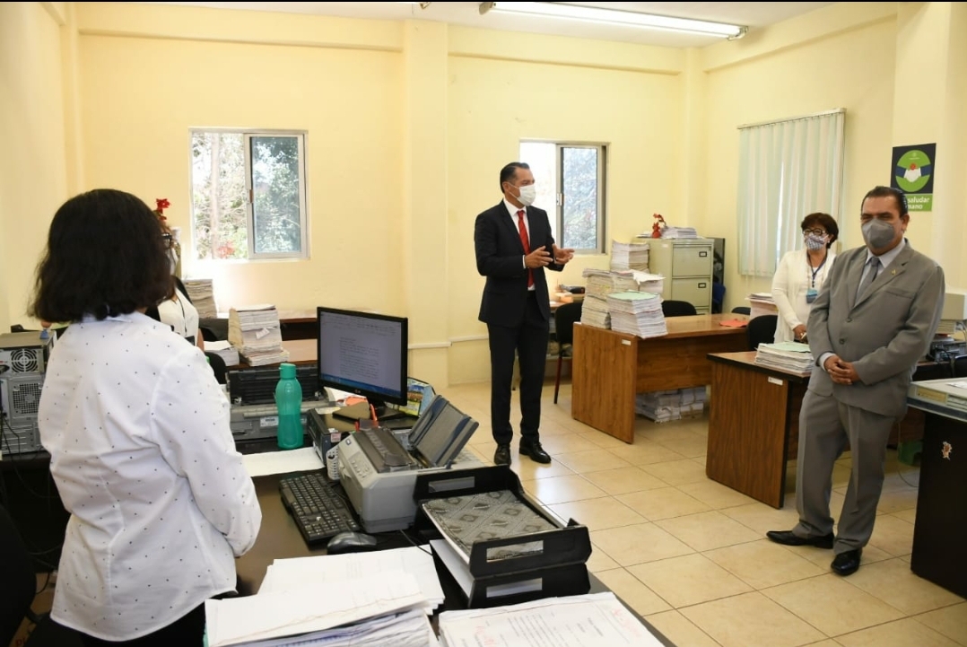 Acompañado por Juezas y Jueces del distrito, el Presidente recorrió también los juzgados Civiles y Penales del sistema de justicia tradicional, a los que entregó equipos de cómputo.